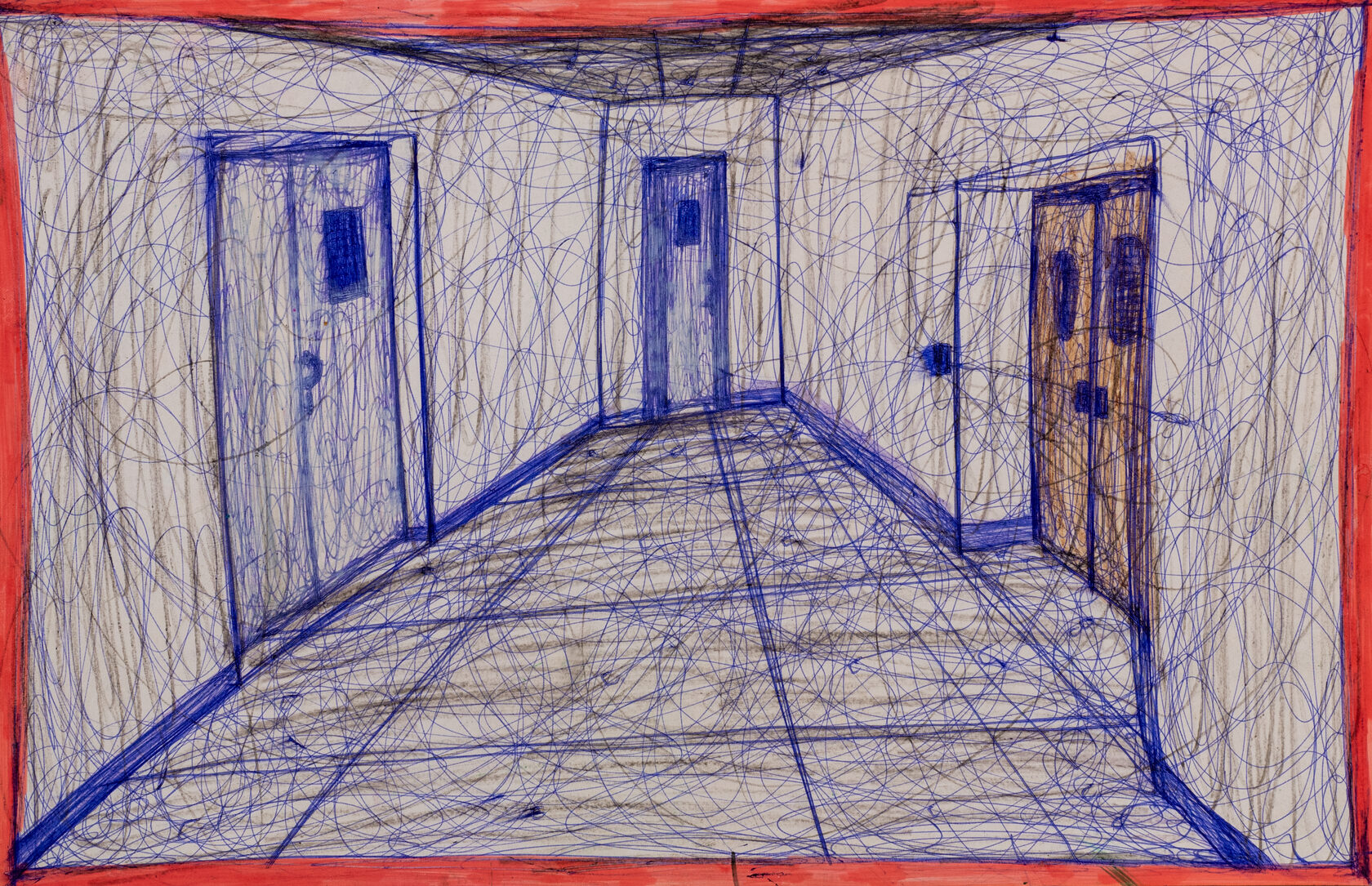 Алексей много изображает интерьеры помещений, в которых можно опознать тюрьму или психоневрологический интернат, но это далеко не всегда буквальное воспроизведение натуры: скорее художник создает мрачные архитектурные фантазии в духе темниц Пиранези, отталкиваясь от выхолощенных интерьеров казенного учреждения. И все же благодаря редким жанровым сценкам и безупречному отображению перспективы возникает соблазн назвать эти рисунки реалистическими. Некоторые работы Сахнова оказываются объединены в серии за счет сквозного нарратива, общего цветового или композиционного решения. Стоит также отметить нечастые, но яркие появления фантастических персонажей — антропоморфных существ с головами животных — в тех самых тюремных интерьерах. Это прикосновение мистического заставляет вспомнить произведения магических реалистов вроде Габриэля Гарсиа Маркеса и Хорхе Луиса Борхеса.